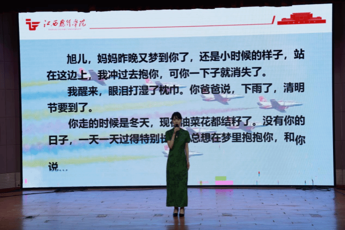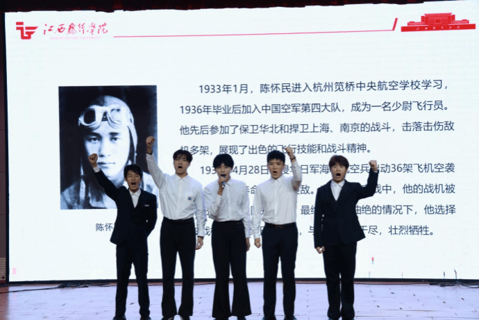 宣讲活动以“一课多师”结合“师生同台”形式开展,马克思主义学院刘立贞、潘则希、罗淦三位老师以“忠诚奉献、自力更生、艰苦奋斗、勇攀高峰”的航空报国精神为主线,分别围绕“起步维艰”“大国觉醒”“逐梦蓝天”三个篇章,通过史料解读、案例分析、精神阐释,系统梳理了中国航空事业的百年发展征程,深刻解读了航空报国精神的时代内涵与实践价值。校”红星领航”社团的同学们带来情景朗诵《穿越时空听听他们的声音》,以声传情重现航空先辈的初心坚守;红色家书诵读《余旭的家书》,字里行间传递着航空人对家国的赤诚热爱;全体师生齐唱《祖国不会忘记》,激昂旋律中满含对航空先辈的缅怀致敬与对蓝天事业的无限憧憬。现场气氛持续高燃,形成师生共学、情感共鸣的良好育人氛围。