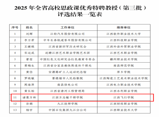 近日,江西省教育厅正式公布了2025年全省“大思政课”建设综合改革试验区改革项目评选结果。经学校推荐、教育厅审核、专家评审及公示等多轮严格程序,我校特聘教授诸葛方林获评“全省高校思政课优秀特聘教授”。